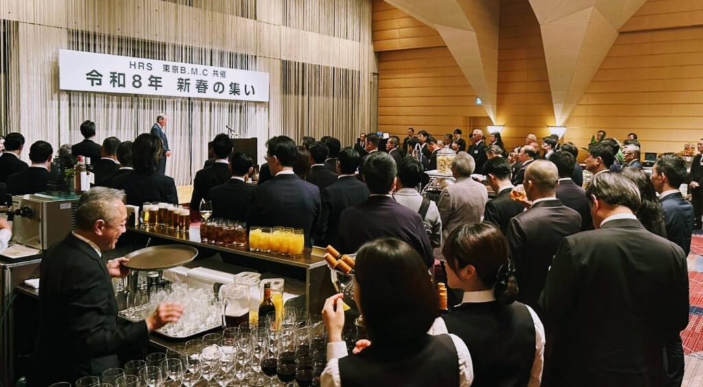 HRSと東京B.M.C.が共催する「令和八年 新春の集い」が2月9日、東京アメリカンクラブで開かれた。人材不足や高齢化が進むなか、現場の経験と次世代の意志をつなぎ、業界の共通課題を前に進めるための交流が濃密に行なわれた。式次第は懇親会を軸に構成され、来賓、会員、関係者が一堂に会する「合流点」として、ホテル産業の未来に向けた温度が確かに立ち上がった。
